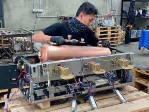 Each machine is fully dismantled down to the frame — every boiler, group head, tap, pipe, valve, and panel is removed.